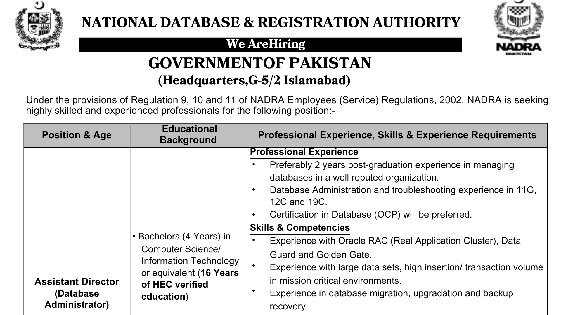 Position Overview: Islamabad HQ Age Limit: 37 Years 27th July 2025 The National Database and Registration Authority (NADRA) is looking for a skilled and motivated Assistant Director (Database Administrator) to join its Islamabad team on a five-year contract, with the possibility of extension. If you are passionate about managing high-performance databases in critical environments, this is your chance to make an impact at a national level. Educational Qualifications Professional Experience Required Technical Skills You need a minimum of 16 years of education, with a Bachelor’s degree (4 years) in Computer Science, Information Technology, or a similar discipline recognized by HEC. Preference will be given to candidates with a Master’s degree. All academic credentials must be attested by HEC during the interview. You must have at least 2 years of post-graduation experience in database administration, preferably with a reputable organization. Proven hands-on experience managing Oracle Databases (versions 11g, 12c, 19c) is required. Candidates with Oracle Certified Professional (OCP) certification will have an advantage. You should have expertise in Oracle RAC, Data Guard, and GoldenGate technologies. Experience in handling large data volumes and high transaction systems in critical IT environments is essential. You must demonstrate skills in database backup, restoration, migration, and upgrade processes. Proficiency in Linux OS and shell scripting is also crucial. You need to handle the installation, configuration, patching, and performance tuning of Oracle databases. You should be able to write complex SQL queries and provide technical support to development teams. Additionally, you must implement database security protocols and compliance standards. Strong skills in database monitoring, troubleshooting, and performance optimization are key. Key Responsibilities: Administer, monitor, and optimize enterprise-level databases. Ensure database availability, reliability, and security. Perform routine backups and conduct disaster recovery drills. Work with development teams for query optimization and schema design. Analyze and resolve system issues to minimize downtime. Maintain detailed documentation for system architecture and procedures. Terms & Conditions: The initial contract is for 5 years, extendable based on performance and organizational needs. NADRA reserves the right to accept or reject any application without providing a reason. Only shortlisted candidates will be contacted for a test or interview. Any misrepresentation or false information will lead to disqualification. Candidates currently employed in Government or Semi-Government institutions must submit a valid No Objection Certificate (NOC) with their application. Medical Fitness and Character Certificates are mandatory for the selected candidate. No travel or daily allowance will be provided for test or interview procedures. Electronic devices, including mobile phones and smartwatches, are not allowed during assessments. HEC-attested degrees must be presented at the interview. How To Apply? Submit Your Application at : https://careers.nadra.gov.pk Deadline: 27th July 2025 Apply Now