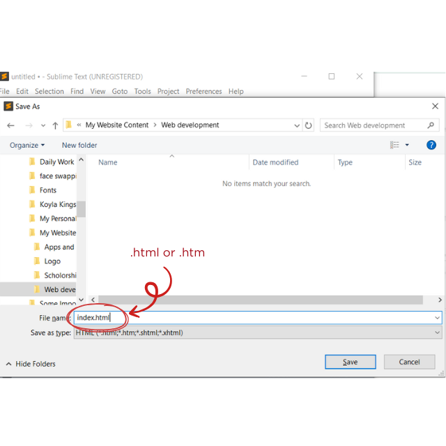 .html. For example:myfirstpage.htmlorindex.html. The.htmlpart tells your computer it's a web page.Make sure the "Save as type" or "Format" dropdown is set to "All Files" or "Plain Text" if you're using a basic editor like Notepad, otherwise it might save as a